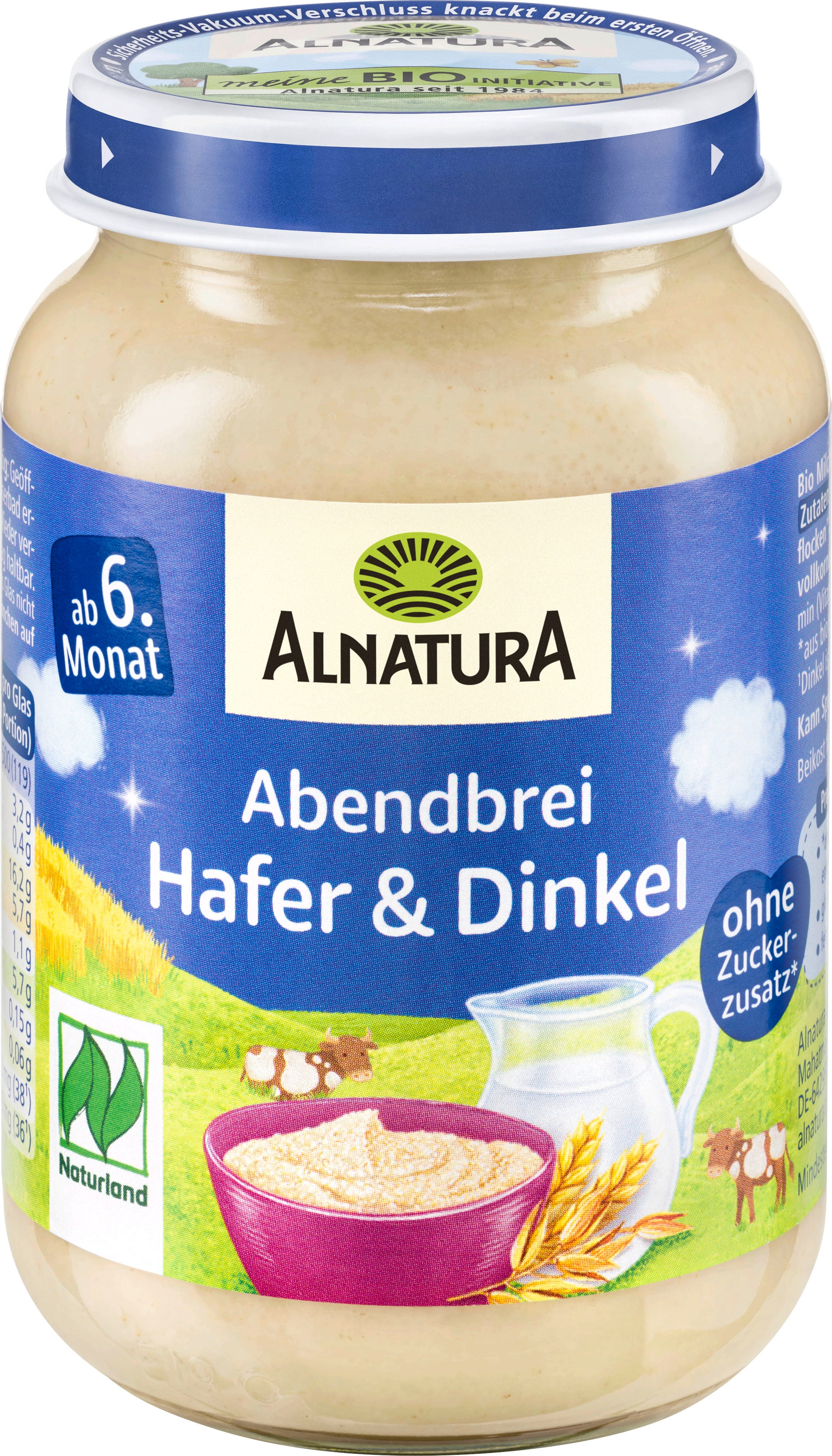 Der fein pürierte Magermilchbrei mit Getreide wie Hafer und Dinkel von Alnatura ohne Zuckerzusatz (Zutaten enthalten von Natur aus Zucker). Für Babys ab dem 6. Lebensmonat warm oder kalt genießbar.