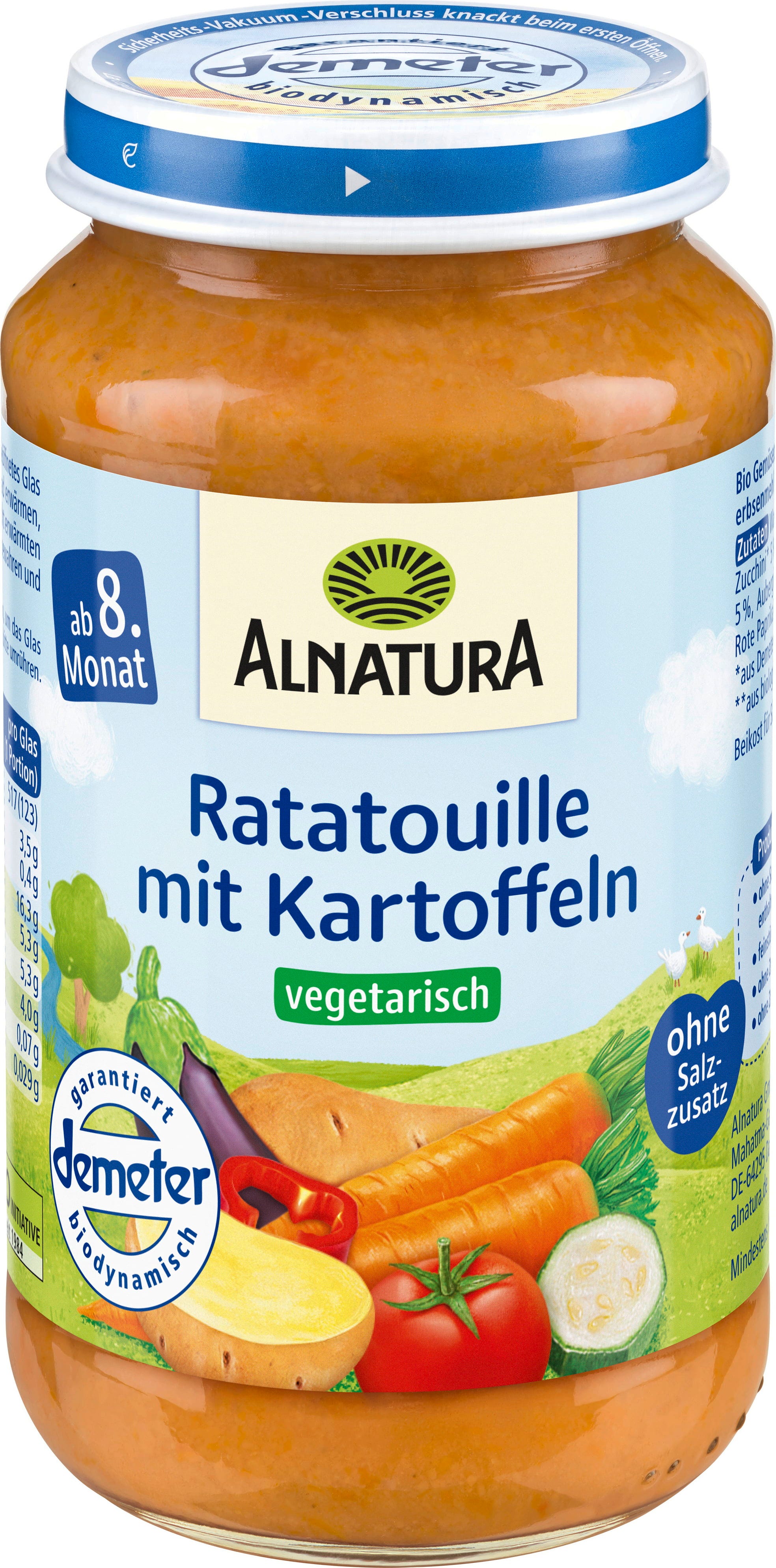 Die Basis der mediterranen Gemüsemahlzeit in Demeter-Qualität bilden Karotten und mediterranes Gemüse wie Zucchini, Auberginen und roter Paprika ohne Zusatz von Milchprodukten und Salz (Zutaten enthalten von Natur aus Salz). Mit der stückigen Konsistenz wird das Kauen angeregt.