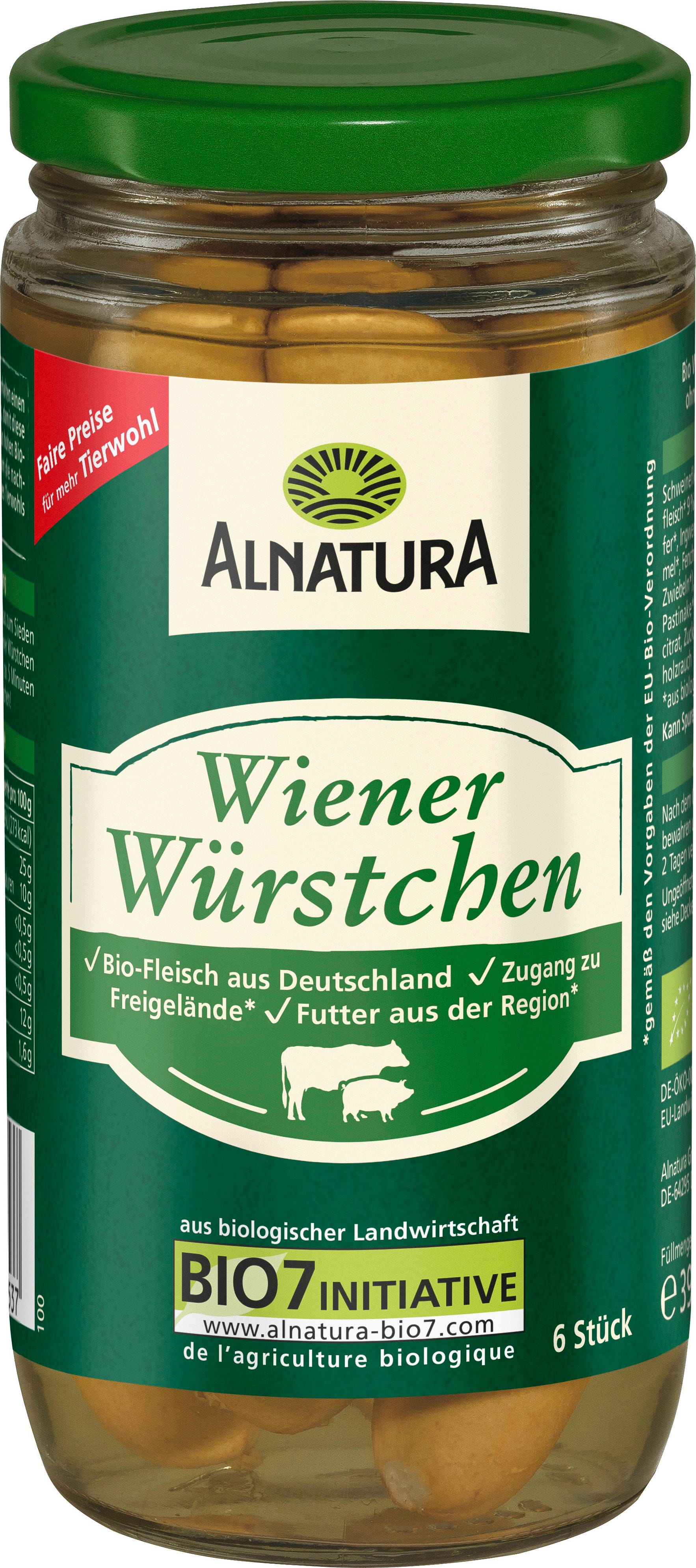 Die Kombination aus verlesenen Gewürzen, Fleisch aus Deutschland und über Buchenholzrauch geräuchert verleiht den Alnatura Bio Wiener Würstchen im Glas ihren charakteristischen Geschmack. Die Initiative "Faire Preise für mehr Tierwohl“ unterstützt Bäuerinnen und Bauern durch angemessene Bezahlung, um das Tierwohl zu förnern.
