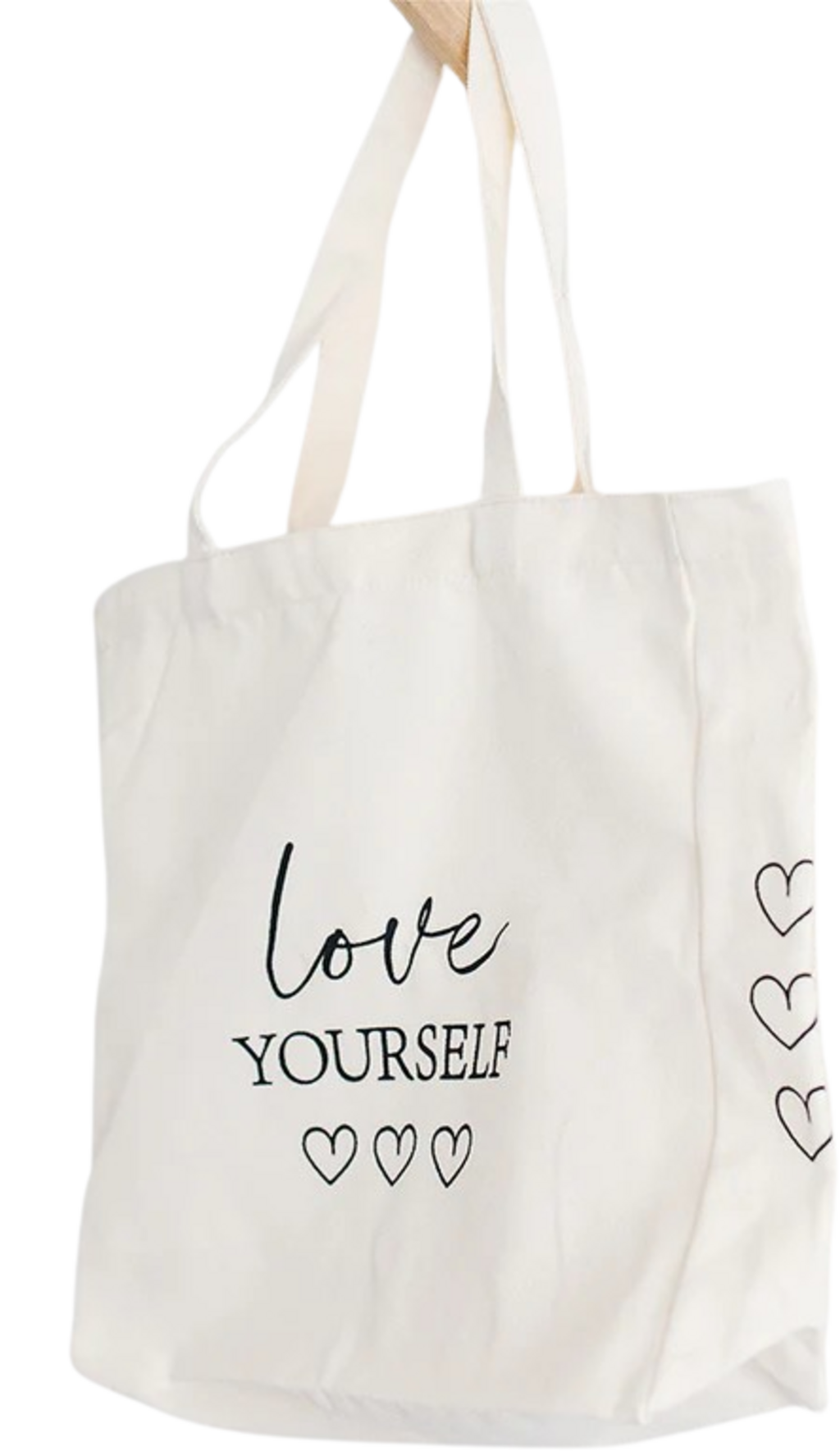 Diese großzügige Tasche aus robustem Baumwollstoff ist sowohl praktisch als auch ausdrucksstark - der Schriftzug "Love Yourself" ziert die Vorderseite, während die Tasche genügend Platz für deine täglichen Essentials bietet.