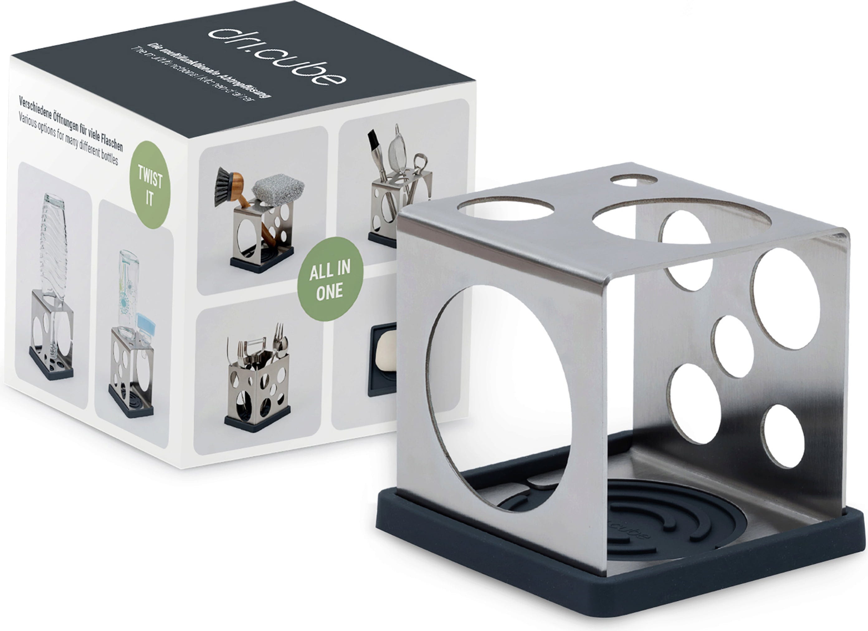 Doch der dri.cube kann noch viel mehr als nur Flaschen halten. Er dient dir als stylischer Organizer für Besteck, Spülbürsten oder sogar als moderner Stiftehalter auf dem Schreibtisch. Die hochwertige Kombination aus gebürstetem oder pulverbeschichtetem Edelstahl und der rutschfesten Silikonunterlage schont deine Oberflächen und fängt Tropfwasser zuverlässig auf. Da alle Teile hitzebeständig und spülmaschinenfest sind, bleibt die Reinigung absolut stressfrei. Ein echter Hingucker, der in jede cleane Küche passt.