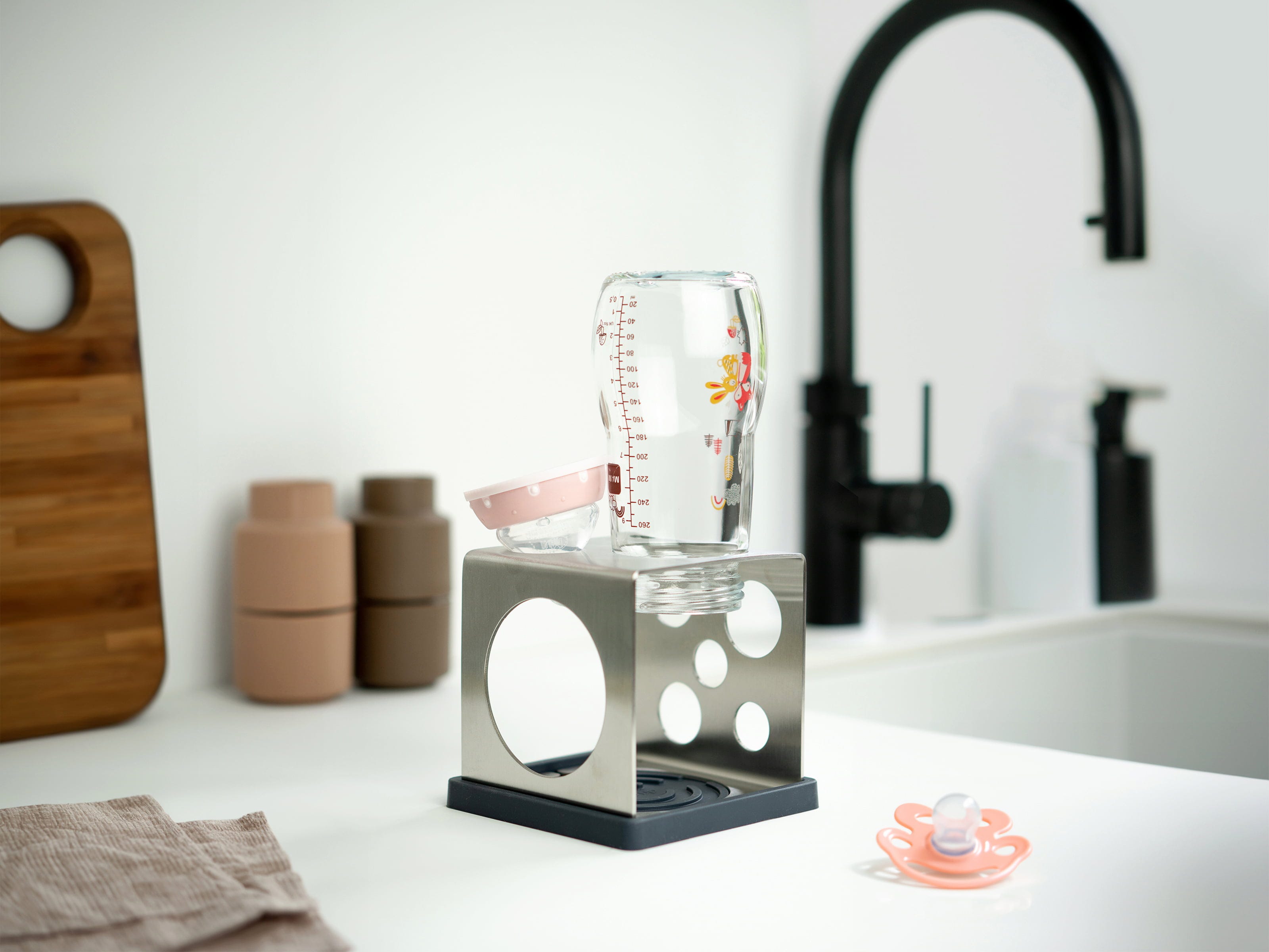 Hol dir den kompakten Alleskönner für deine Küche: Der dri.cube vereint minimalistisches Schweizer Design mit maximaler Funktionalität auf kleinstem Raum. Dank seiner sechs verschiedenen Seiten bietet dieser smarte Würfel für fast jede Flaschengröße – von der Sodastream- bis zur Babyflasche – die passende Abtropföffnung. So trocknen deine Gefäße hygienisch und sicher, ohne umzukippen.