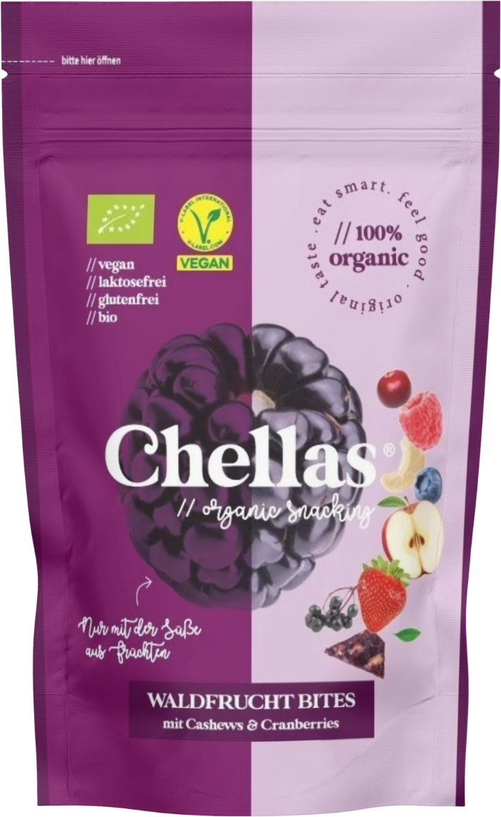 Die Bio Waldfrucht Bites von Chellas bringen die volle Beerenpower in handliche Form: Erdbeeren, Brombeeren, Heidelbeeren, Himbeeren und Holunderbeeren verschmelzen mit knackigen Cashewkernen und fruchtigen Cranberries zu einem intensiven Geschmackserlebnis. Die Süße stammt ausschließlich aus den Früchten – ganz ohne künstliche Zusätze, Palmöl oder Zucker. In liebevoller Handarbeit in Österreich hergestellt, überzeugen sie durch Qualität und Natürlichkeit. Ob im Büro, unterwegs oder auf Reisen – der praktische Frischebeutel macht Chellas zum idealen Begleiter für jeden Tag.