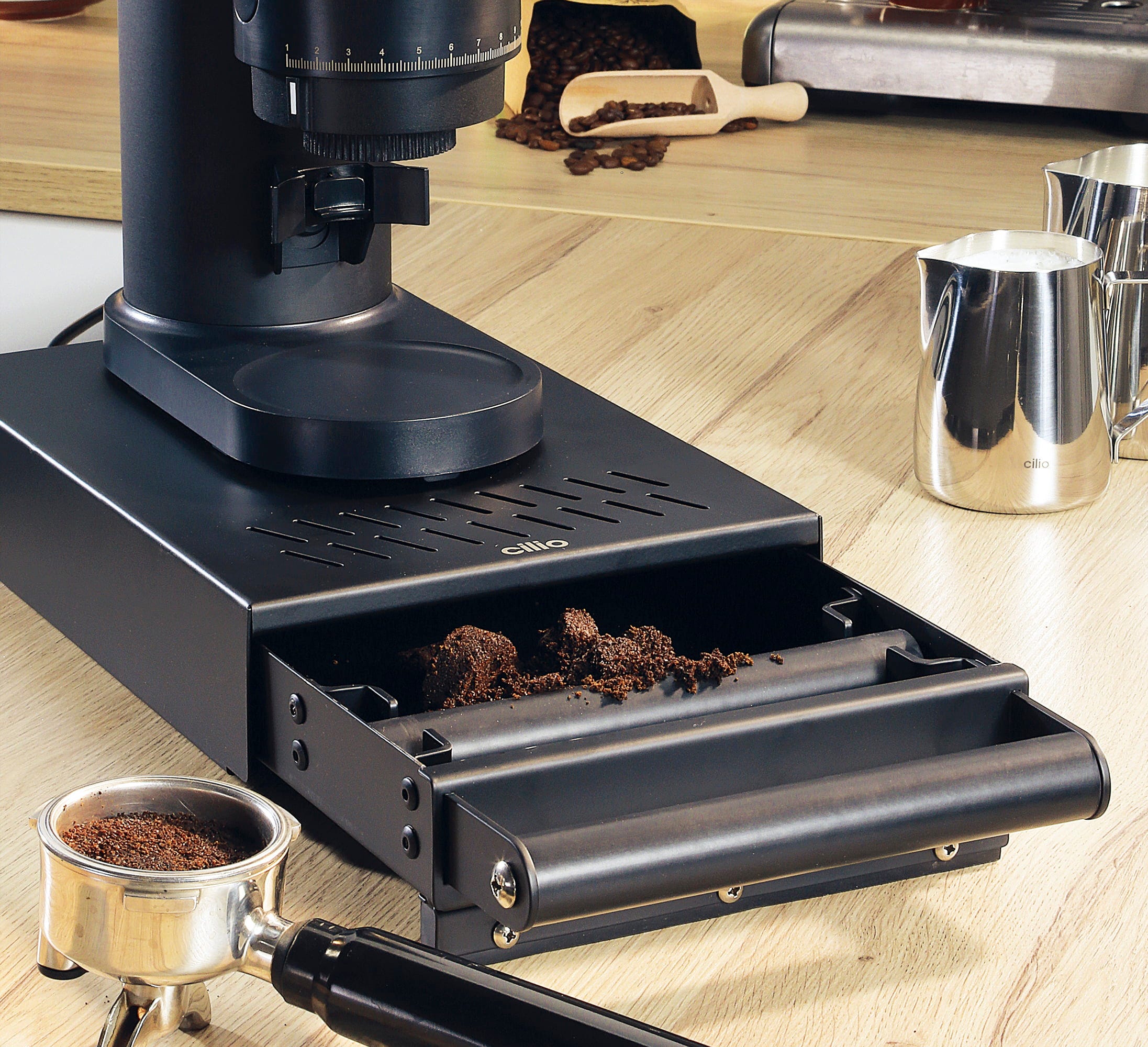 Vollende dein Home-Barista-Setup mit der cilio Sudschublade BARISTA. Sie ist die ideale Lösung, um Kaffeesatz platzsparend und stilvoll zu entsorgen. Dank ihrer stabilen Bauweise und den rutschfesten Füßen dient sie gleichzeitig als perfekte Unterlage für eine kleine Siebträgermaschine oder die elektrische Kaffeemühle. Der abnehmbare, gummierte Abschlagsteg dämpft die Schläge deines Siebträgers effektiv ab. Das schont nicht nur deine Ohren, sondern auch das Material deines Equipments.