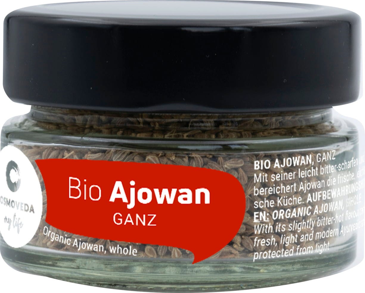 Ajowan erinnert im Geschmack an Thymian und wird zerstoßen oder gemahlen, indischen Gerichten oder Currymischungen zugegeben. Das auch als Königskümmel bekannte Gewürz passt gut zu Kartoffeln, Brot, Gebäck und Hülsenfrüchten und wird gerne mit Ingwer und Asafoetida kombiniert.