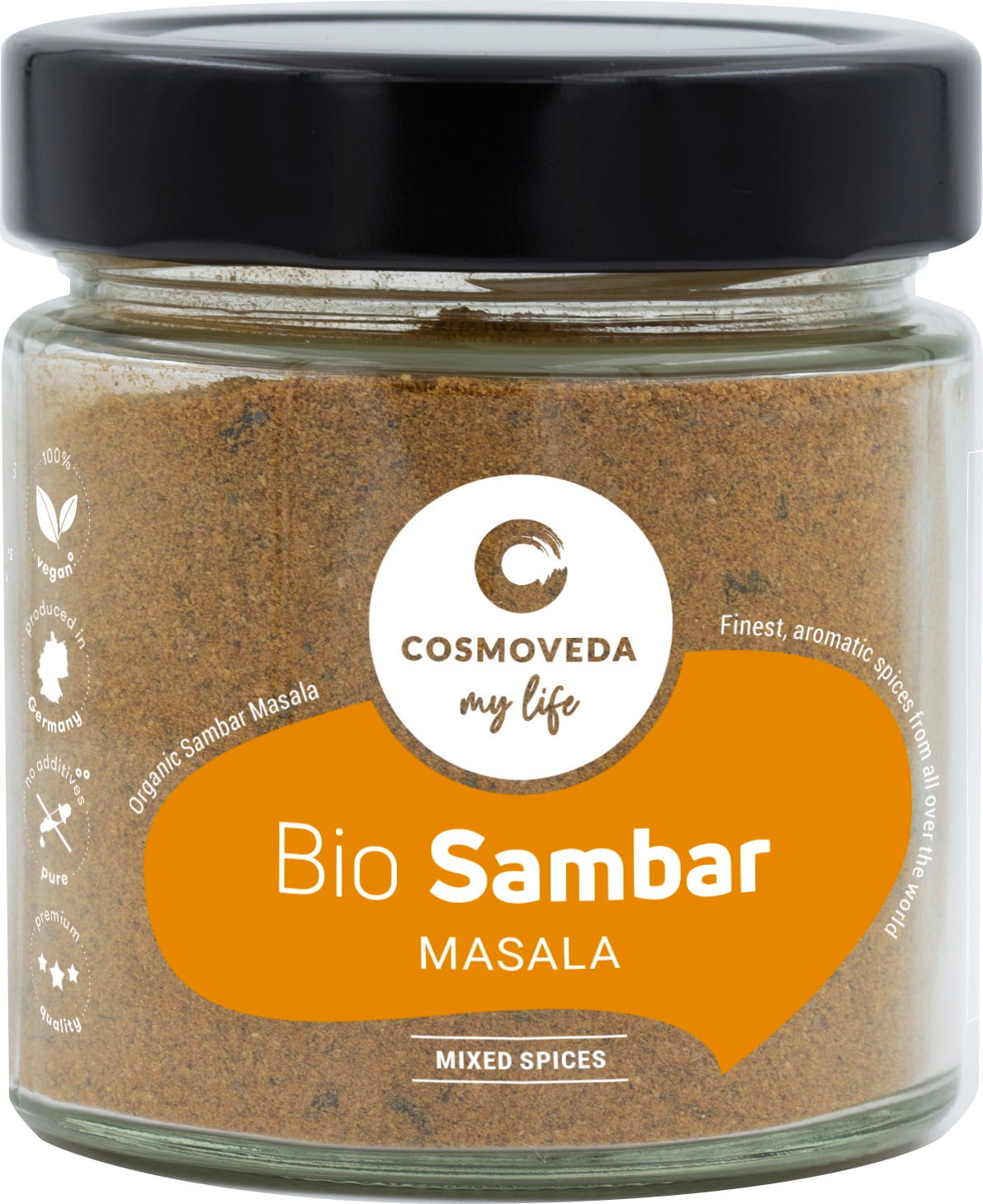 COSMOVEDA BIO Sambar Masala, eine speziell abgestimmte ayurvedische Mischung erlesener Gewürze, die Ihnen ein köstliches Sambar gelingen lässt.