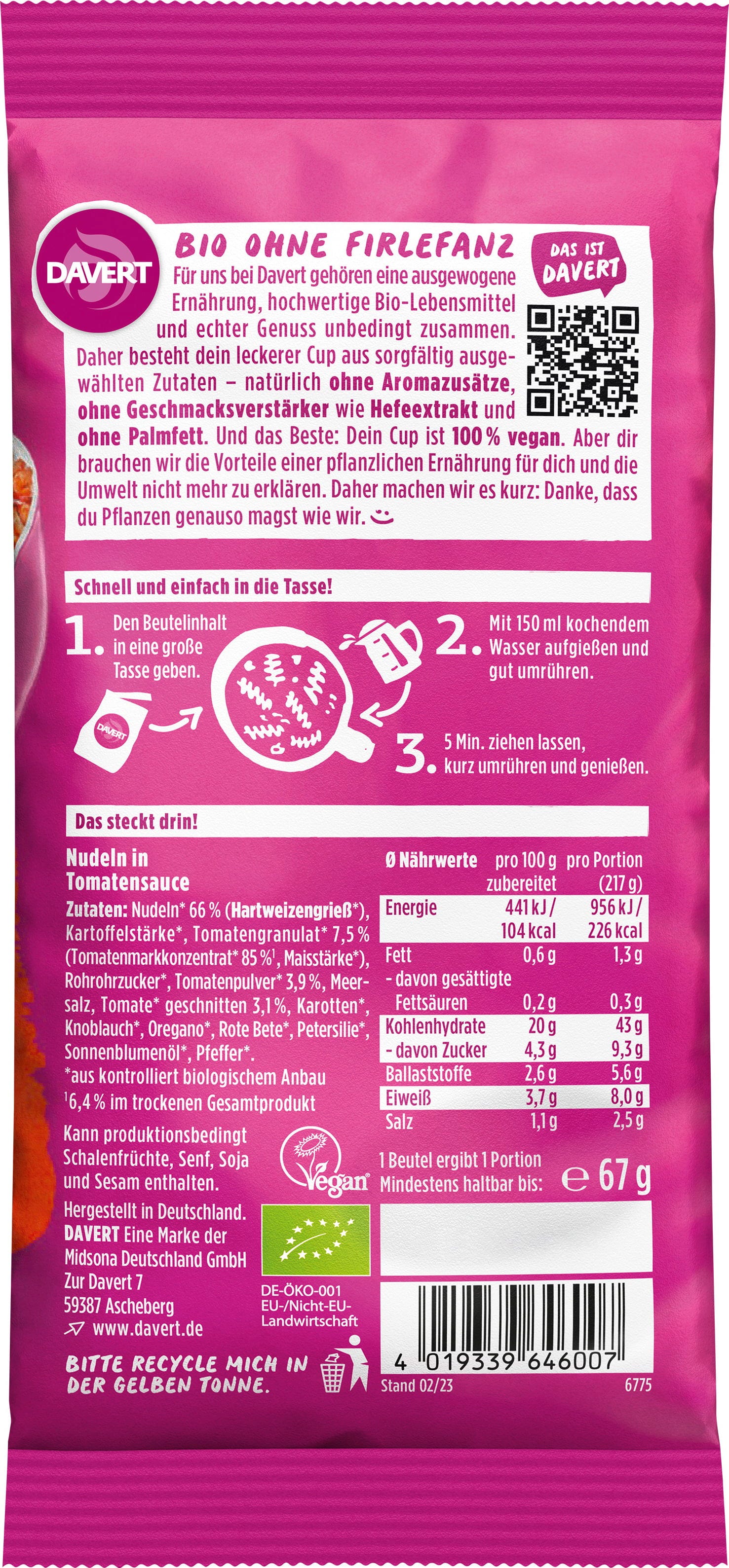 Davert Bio Noodle-Cup Tomatensauce, 67 g