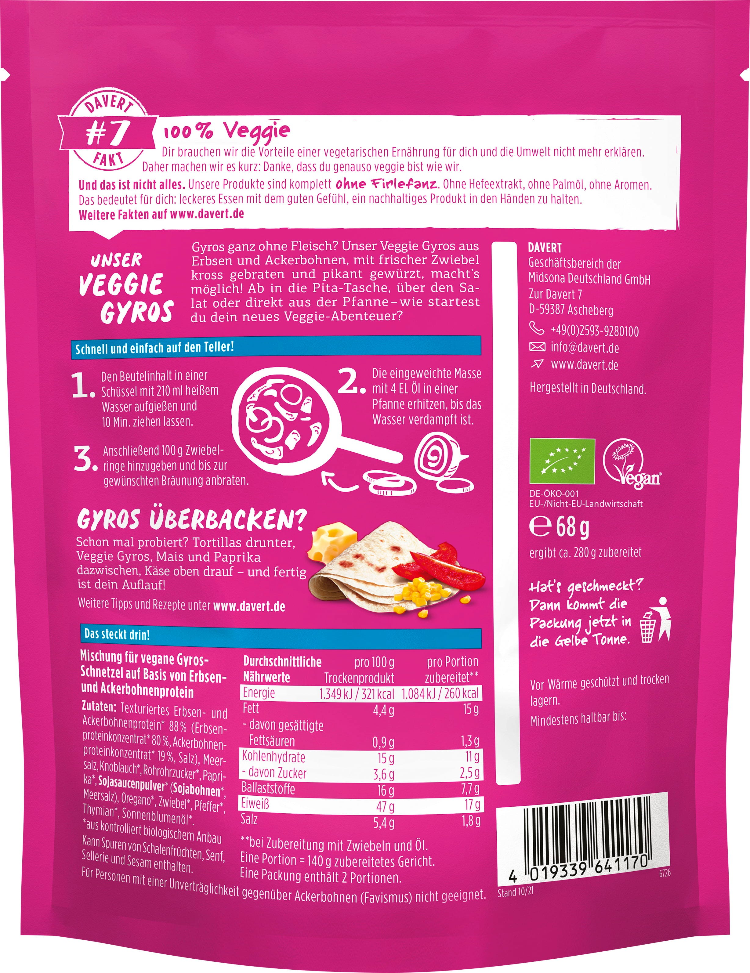 Davert Bio Veggie Gyros - auf Erbsenproteinbasis, 68 g