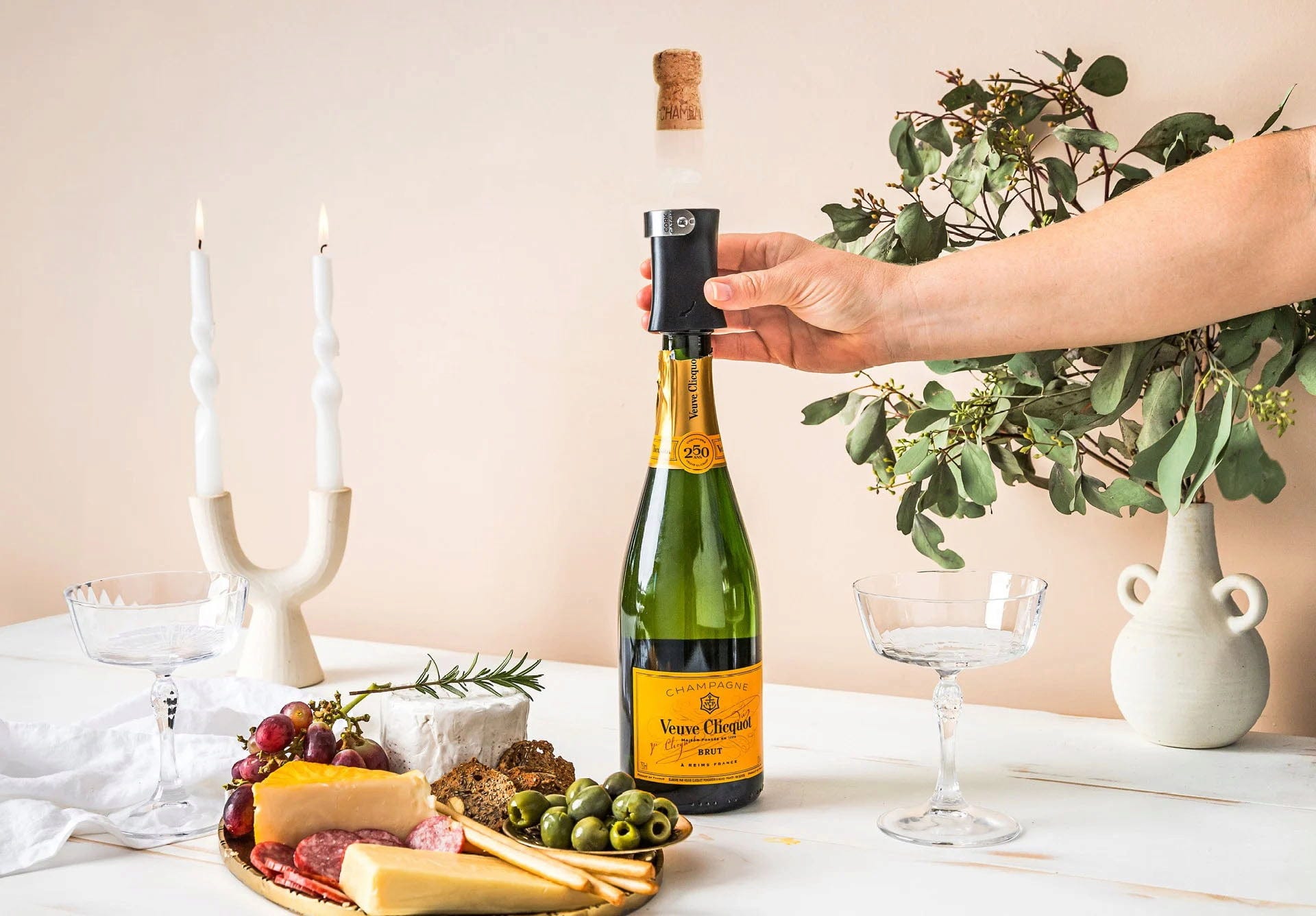 Mit dem Champop von Dreamfarm musst du dir beim Entkorken deiner Champagnerflaschen keine Sorgen mehr um unkontrolliert umherfliegende Korken oder übersprudelnde Getränke machen! Dieses clevere Gadget setzt du einfach auf den Flaschenhals auf und drehst es leicht, um den Korken kontrolliert zu lösen. Dank der integrierten Entlüftungsschlitze wird der Druck sanft abgelassen und die Geschwindigkeit des Korkens so reduziert, dass er sicher im Gehäuse aufgefangen wird – das ist der Lock-Modus.