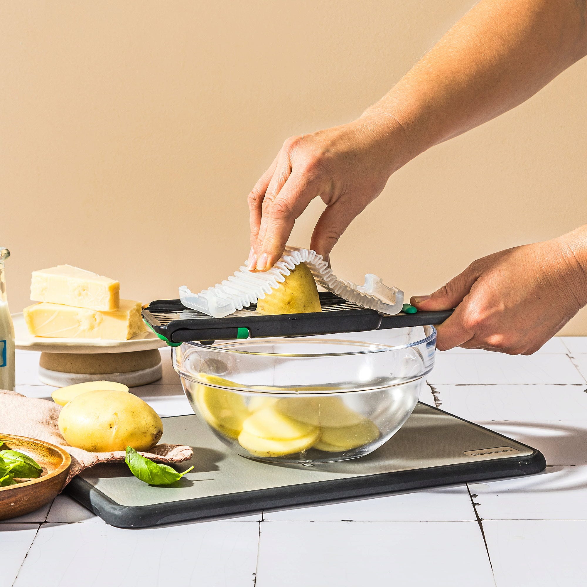 Salat, Kartoffeln, frisches Gemüse und knackiger Salat lassen sich jetzt so schnell und sicher wie nie zuvor in perfekte Scheiben schneiden! Die Nocutu Mandoline von Dreamfarm punktet mit einer rasiermesserscharfen Edelstahlklinge, die du ganz nach deinem Bedarf zwischen 1 und 3 mm Dicke einstellen kannst. Damit du dir beim Arbeiten keine Sorgen um deine Finger machen musst, gehört ein großzügiger, flexibler Fingerschutz zum Set, der dich zuverlässig vor Verletzungen bewahrt.