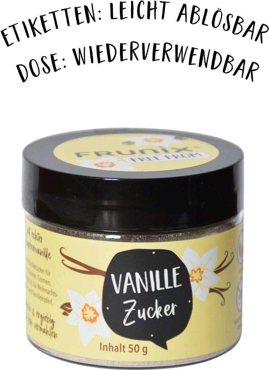 Vanillekipferl, Obstsalat-Dressings, Puddings, Kakao - FRUNIX® Vanillezucker mit 6 % echter Bourbon-Vanille verleiht Backwaren, Speisen und Getränken einen himmlischen Vanillegeschmack! Dank des intensiven Aromas ist das Produkt besonders ergiebig: Ein Teelöffel entspricht einem ganzen Päckchen herkömmlichen Vanillezuckers - anfangs mit Gefühl dosieren!