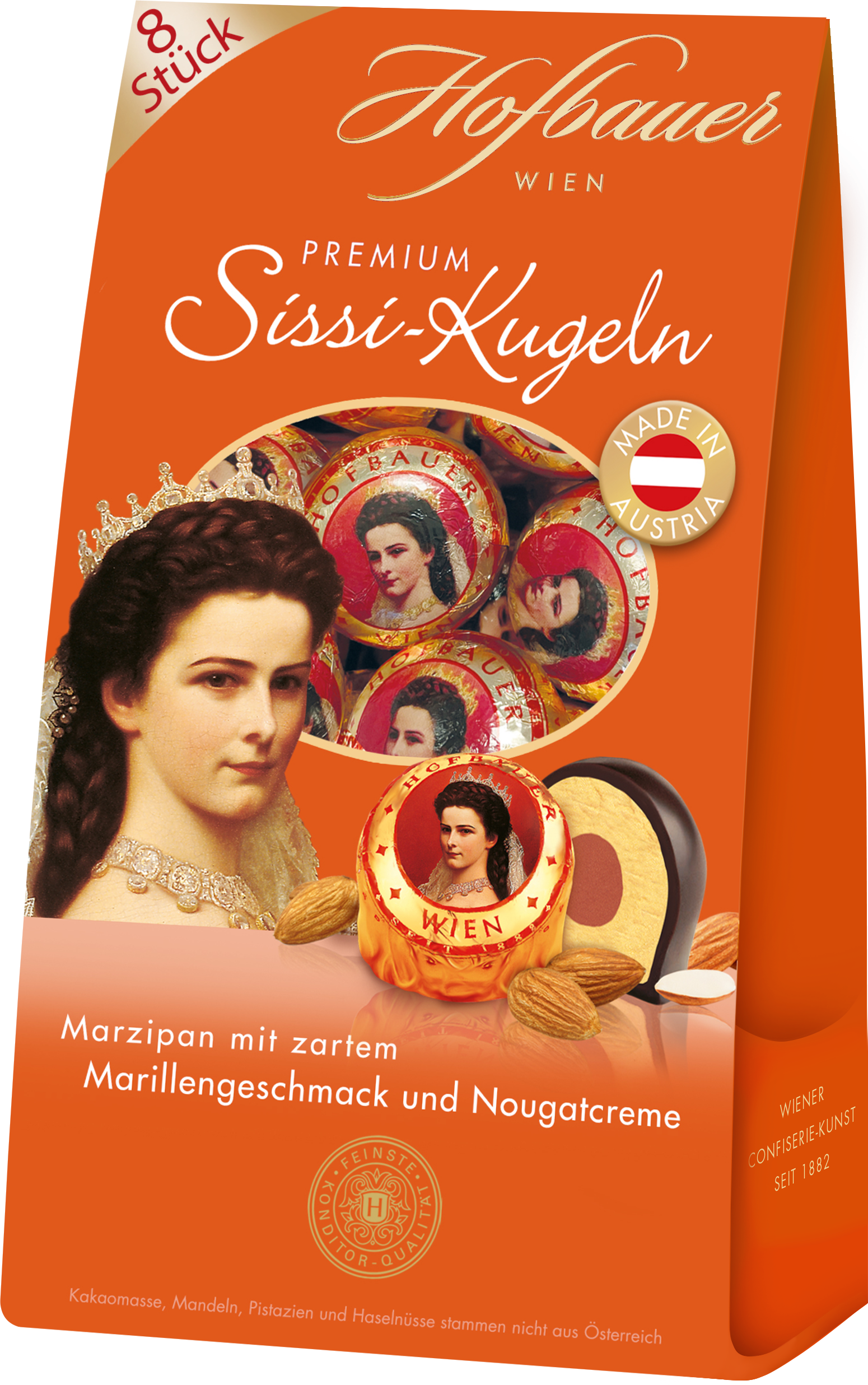 Hofbauer setzt der einstigen Kaiserin ein besonderes Denkmal. Genieße edles Mandelmarzipan mit Marillengeschmack und einem Kern aus Haselnuss-Nougat-Creme. Die Sissi-Kugeln sind umhüllt von feinster Schokolade inklusive einer fruchtigen Note.