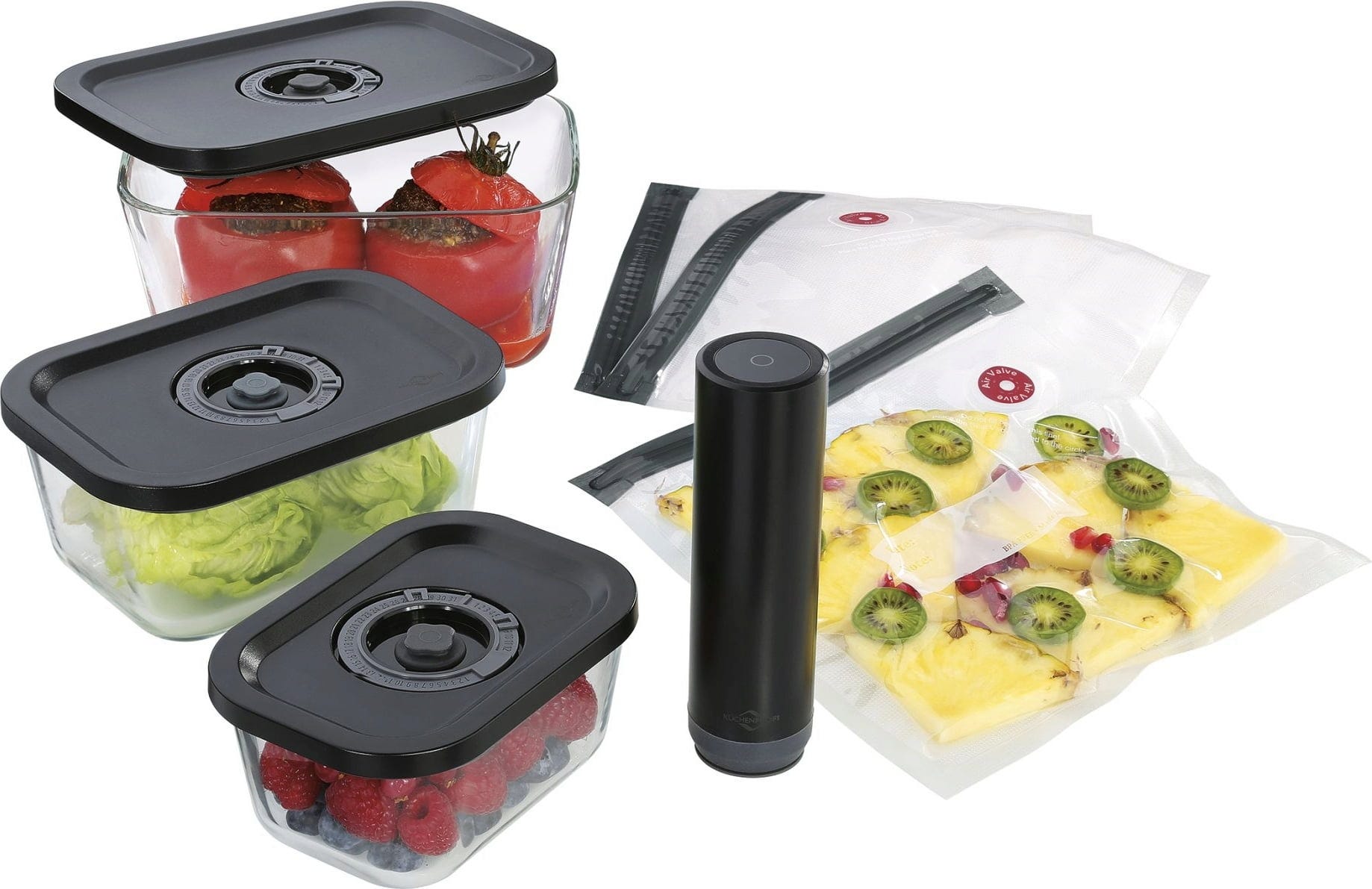 Mit dem 7-teiligen EASYFRESH Vakuumierset von Küchenprofi wird Vorbereiten, Frischhalten und Aufbewahren so einfach wie nie.