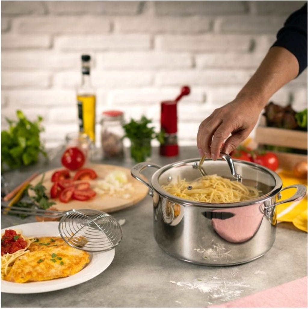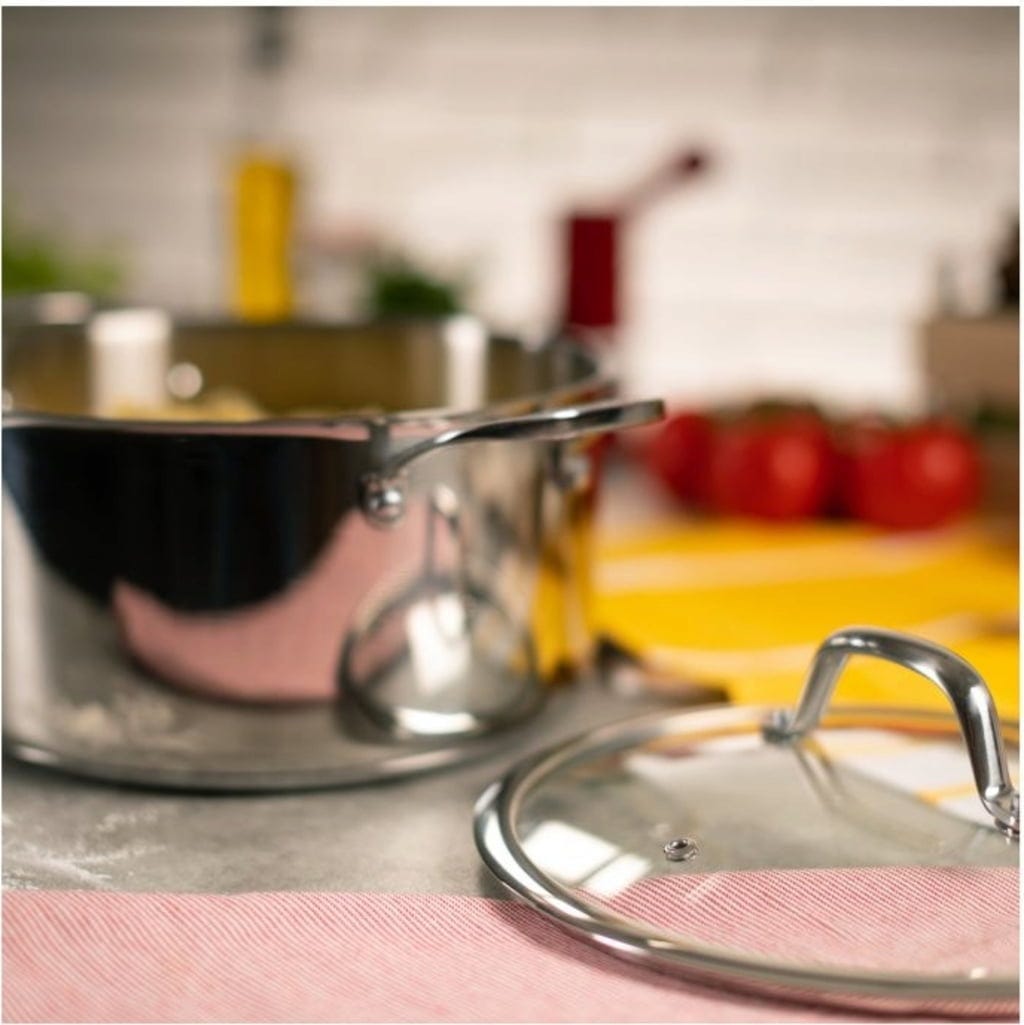 Er besteht aus hochwertigem Edelstahl und verfügt über einen dicken Boden, der für eine optimale Wärmeverteilung und -speicherung sorgt, sodass beim Kochen keine Energie verschwendet wird. Die praktischen Griffe an den Seiten werden auch bei hohen Temperaturen nicht heiß und dank des Glasdeckels mit integrierter Dampföffnung hast du auch während des Kochens alles im Blick.