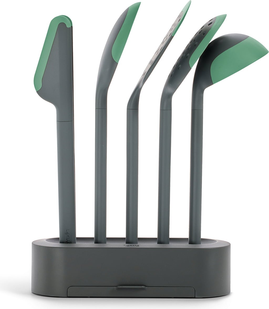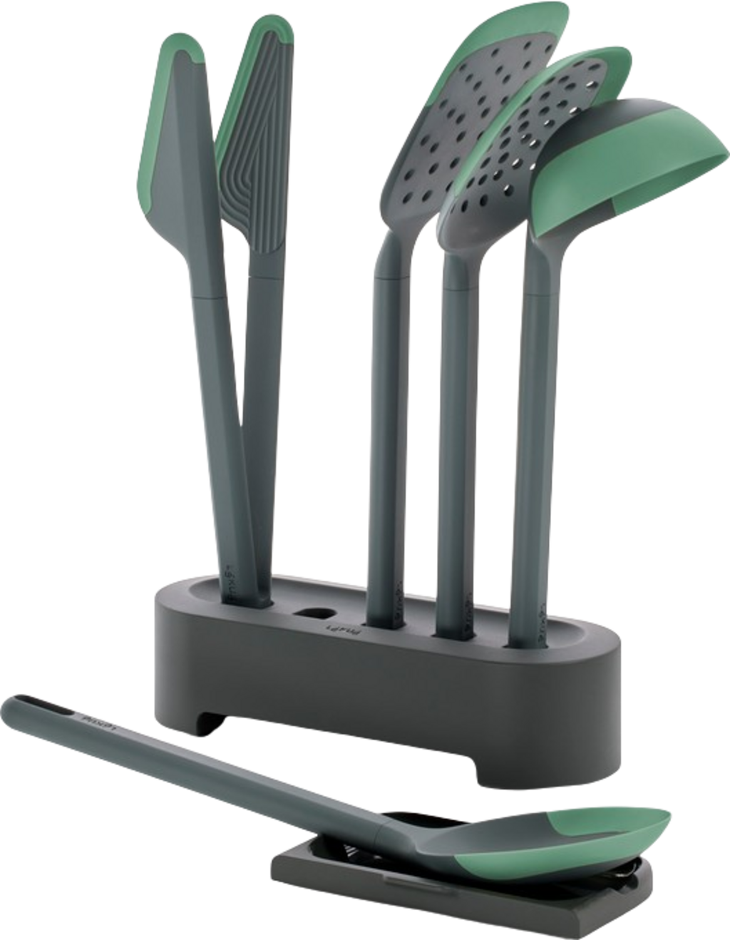Aufbewahrt werden die Küchenhelfer in einer innovativen, länglich-schmalen Halterung, die auf der Arbeitsfläche nicht nur Platz spart, sondern die Utensilien auch stets griffbereit hält. Besonders praktisch ist auch die zusätzliche kleine Ablage, auf der du die Utensilien während des ablegen kannst, ohne dabei die Arbeitsfläche zu verschmutzen.