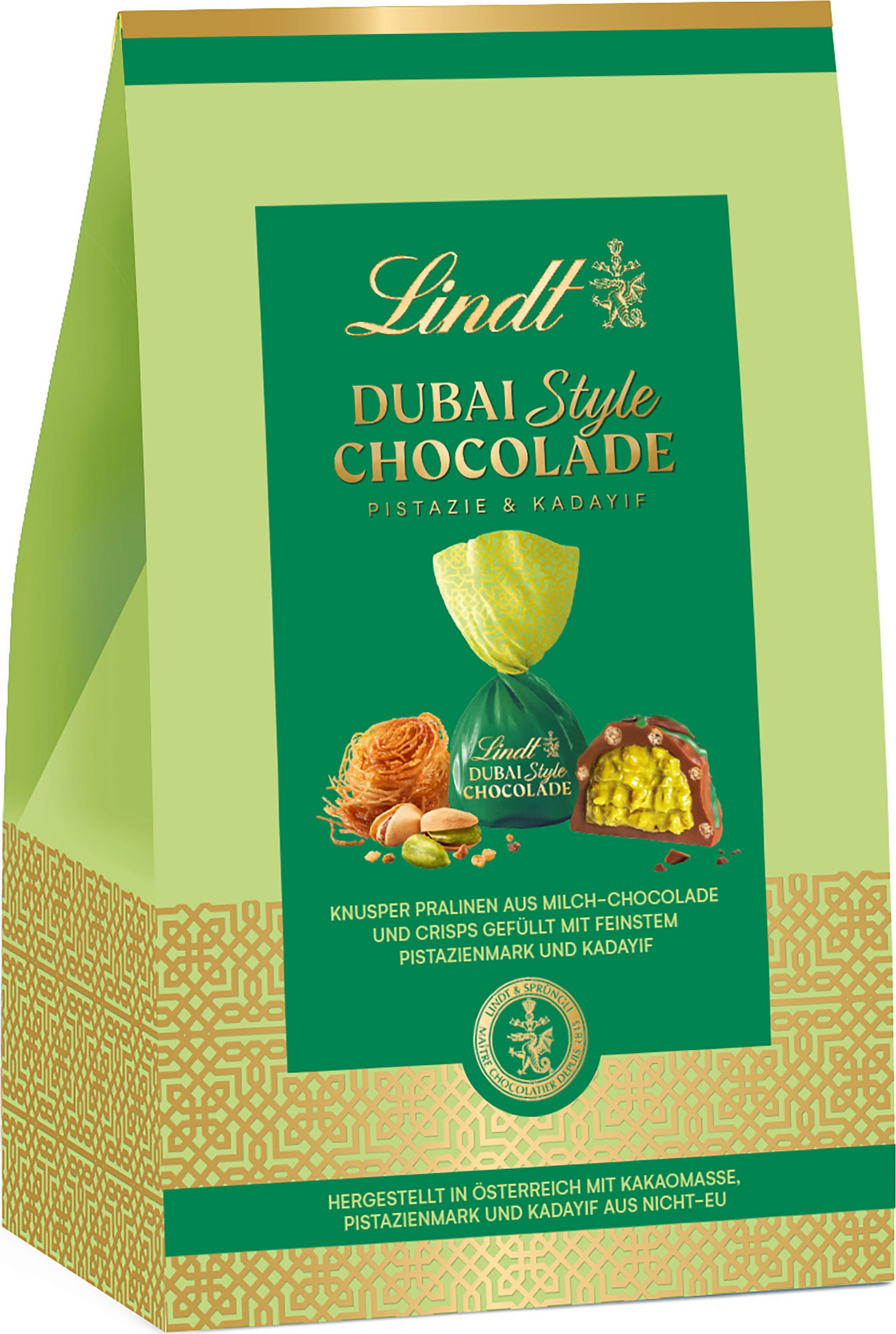 Einzigartig zartschmelzende Lindt Vollmilch-Schokolade umhüllt eine Füllung, die durch ihre Intensität besticht. Das Herzstück bildet feinstes Pistazienmarzipan, das für eine intensive, nussige Note sorgt. Für das gewisse Extra an Textur ist die Füllung mit knusprigem Kadayif veredelt, der bei jedem Bissen einen aufregenden Crunch liefert. Von außen sorgt eine zusätzliche Hülle aus knusprigem Crisp dafür, dass dieses Geschmackserlebnis eine ganz besondere Textur erhält.