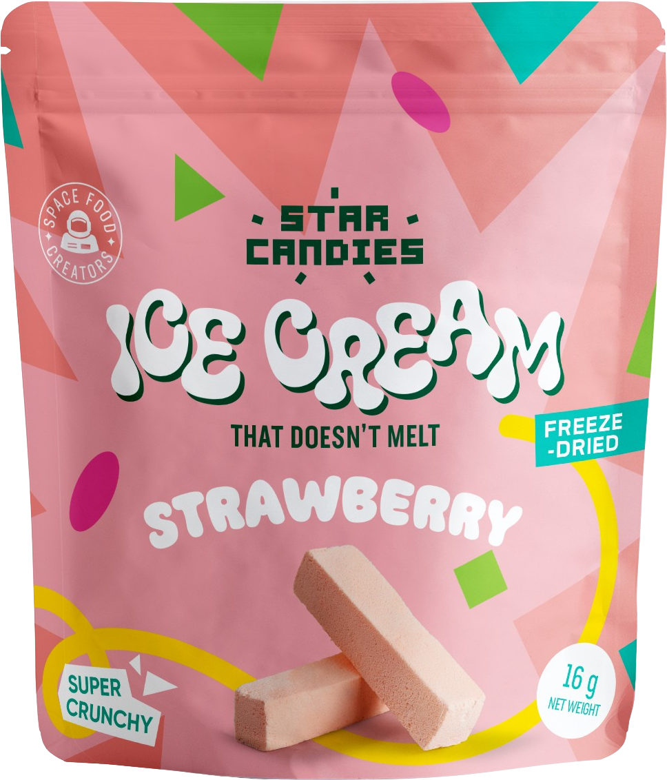 Entdecke das STAR CANDIES gefriergetrocknete Eis mit Erdbeergeschmack von Supergarden! Dieses außergewöhnliche Dessert ist exotisch, herrlich knusprig, federleicht und schmilzt nicht – der volle Eisgenuss ganz ohne Gefrierschrank!