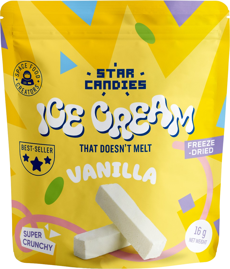 Entdecke das STAR CANDIES gefriergetrocknete Eis mit Vanillegeschmack von Supergarden! Dieses außergewöhnliche Dessert ist exotisch, herrlich knusprig, federleicht und schmilzt nicht – der volle Eisgenuss ganz ohne Gefrierschrank!