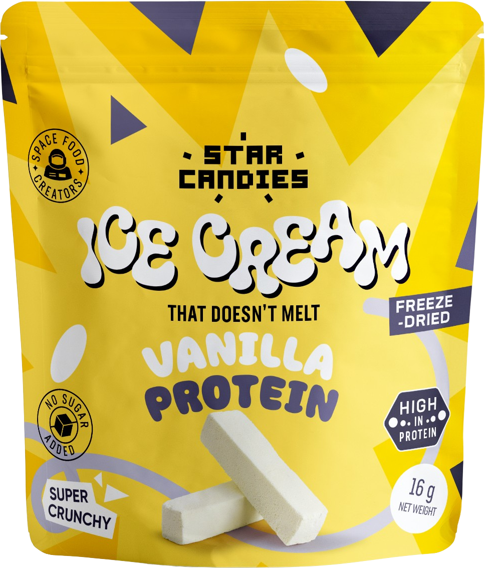 Entdecke das STAR CANDIES gefriergetrocknete Eis mit Vanillegeschmack und einer Extraportion Protein von Supergarden! Dieses außergewöhnliche Dessert ist exotisch, herrlich knusprig, federleicht und schmilzt nicht – der volle Eisgenuss ganz ohne Gefrierschrank!