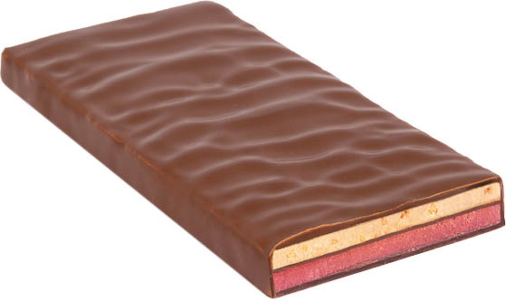 Haferschokolade umhüllt eine Fruchtschicht aus Erdbeeren, Kirschen, Himbeeren und Preiselbeeren sowie eine Schicht nussiges Mandelnougat. Aufgepeppt wird die Füllung mit Maracujastückchen, Orangen und Zitronen. Die Rezeptur ist vegan und alkoholfrei.