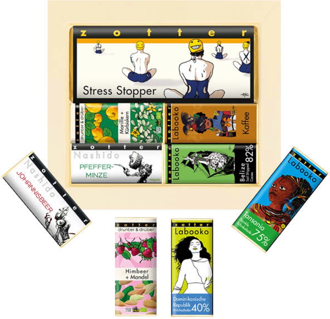 Dieser leckere Zotter-Mix eignet sich ideal, um sich in stressigen Phase einige zartschmelzende Verwöhnmomente zu gönnen! Mit einer handgeschöpften Schokolade, zwei "drunter & drüber"-Minis, zwei gefüllten Nashido-Tafeln und vier Labooko-Minis ist der Genuss garantiert und der Stress schnell verschwunden!